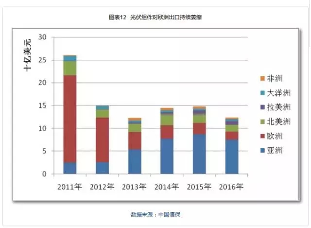 從洲別市場來看,2016年我國光伏組件對所有洲別市場出口額均表現(xiàn)為同比下滑。