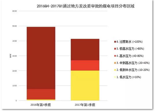 在進(jìn)一步梳理各省發(fā)改委公布的煤電核準(zhǔn)信息以及環(huán)評(píng)審批數(shù)據(jù)時(shí)大嘴君發(fā)現(xiàn),2016年第四季度和2017年第一季度地方發(fā)改委新審批的煤電項(xiàng)目中,有超過60%的煤電項(xiàng)目位于“過度取水”區(qū),同時(shí)有超過80%的項(xiàng)目位于高水壓力區(qū)。