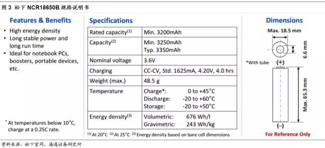 Model S所用18650電池是松下產(chǎn)的型號為NCR18650B三元材料電池,電容量約3.3mA,電壓達到3.6V,能量密度高達243Wh/kg。