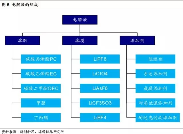 根據(jù)中國電池網(wǎng)的推算,在電解液的成本構(gòu)成中,溶劑約占30%,添加劑約占10%,最主要的成分溶質(zhì)約占60%。市場上的溶質(zhì)以六氟磷酸鋰(LiPF6)為主,松下NCR18650電池也選用了六氟磷酸鋰作為溶質(zhì),每kWh鋰電池需要0.15kg的六氟磷酸鋰。六氟磷酸鋰同樣可以通過碳酸鋰制備。
