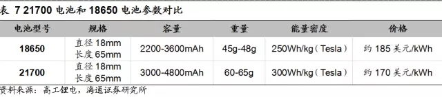 21700電池的能量密度要優(yōu)于18650電池。根據(jù)目前特斯拉披露的信息,在現(xiàn)有條件下,其生產(chǎn)的21700電池系統(tǒng)的能量密度在300Wh/kg左右,比其原來18650電池系統(tǒng)的250Wh/kg約提高20%,容量也將達到4.8Ah左右。