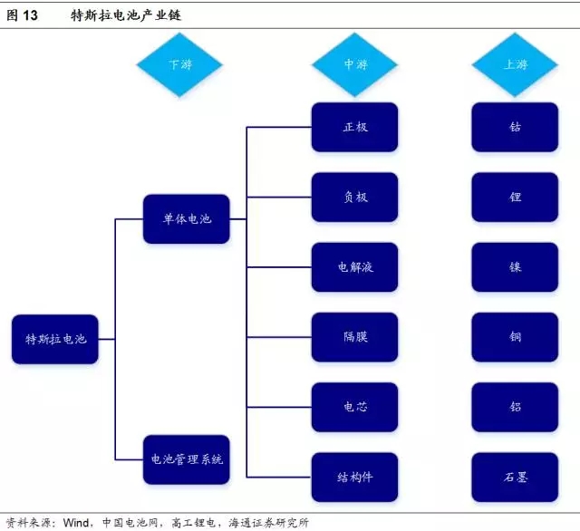 由于特斯拉的電池系統(tǒng)可以分為兩個層次:單體電池以及電池組管理系統(tǒng),那么以特斯拉電池為原點、以這兩個層次為路徑向上游追溯,則可以梳理出其完整的產(chǎn)業(yè)鏈。