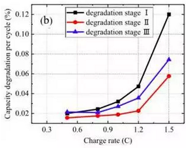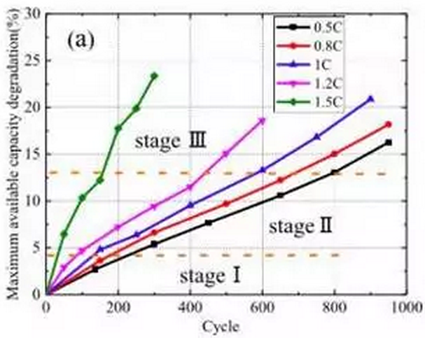 從數據可以看到,隨著充電的倍率的加大,鋰離子電池的衰降速率也在快速增加,并且從曲線的斜率來看,電池的衰降速度存在三個不同的階段,前期衰降速度較快的階段(階段1),中間衰降速度較慢的穩(wěn)定階段(階段2),和后期的衰降速率加速階段(階段3)。