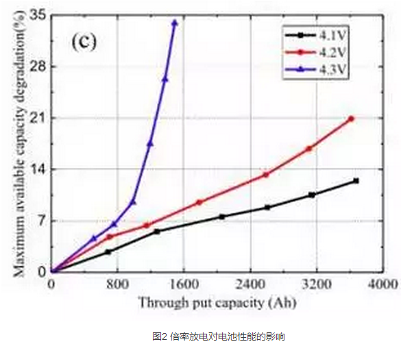 圖C是針對不同的截止電壓對電池衰降速度影響的實驗,從實驗結果可以看到,當把充電截止電壓提高到4.3V時會導致電池的循環(huán)性能急劇惡化,降低充電截止電壓可以有效的改善電池的循環(huán)性能。