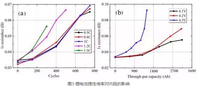 從圖b的測試結果來看,當充電截止電壓為4.3V時,電池動態(tài)內阻增加非常迅速表明高截止電壓會惡化電池的動力學條件,截止電壓為4.1V和4.2V時電池動態(tài)內阻增加較為緩慢。