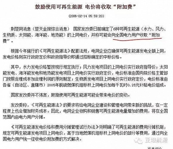 從2006年《可再生能源法》頒布伊始,國家就征收0.002元/千瓦時,用來給新能源進行補貼,然而,這個附加費已經(jīng)增加到0.019元/千瓦時(2015.12.30日公布),8年增長了7倍。