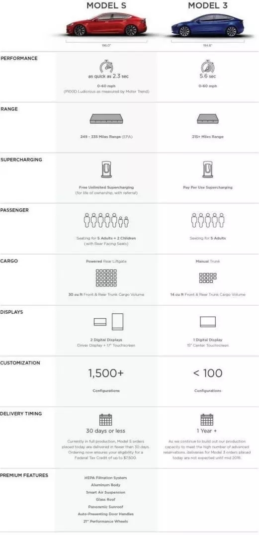 由圖一可知,Model 3在續(xù)航里程數(shù)、百公里加速、車內(nèi)空間等方面均遜色于Model S。據(jù)特斯拉官方消息,Model 3的續(xù)航里程為345公里(Model S為450km-573km),百公里加速為5.6s(Model S 為2.7s)。但是Model 3 起售價僅為35000美金(約合23萬人民幣),被追捧者視為超高性價比!