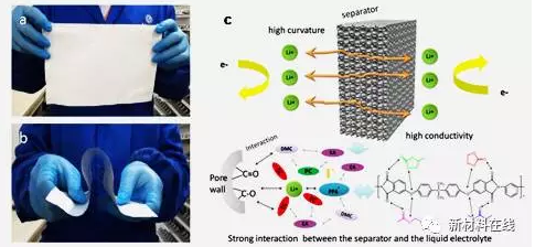 寧波材料所動力鋰電池工程實驗室與大連化學(xué)物理研究所儲能技術(shù)研究部,采用濕法過程一次成型技術(shù),共同研發(fā)了一種新型耐高溫多孔隔膜,這種多孔隔膜制備成本低,易于量化生產(chǎn)。初步研究結(jié)果表明,隔膜的熱變形溫度遠高于200℃,與商品化的無紡布隔膜的熱穩(wěn)定性相當(dāng),可有效保障電池安全性。同時,這種多孔膜具有高孔隙率及高曲率的孔結(jié)構(gòu),能夠在保證電池容量發(fā)揮的同時有效避免電池的微短路及自放電現(xiàn)象。除此之外,寧波材料所還開發(fā)出了具有超薄離子可交換功能層的耐熱復(fù)合隔膜、基于三維耐熱骨架的凝膠復(fù)合隔膜以及陶瓷隔膜。