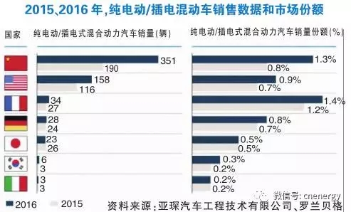 在市場規(guī)模層面,整體而言,2016年,僅有法國與中國兩個國家的純電動和插電式混合動力汽車市場份額超過1%。