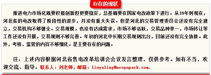 電改的內(nèi)容簡單的說就是“管住中間、放開兩頭”,當前主要應(yīng)該是電力市場化和電力價格方面。重點在電力市場化方面。河北電網(wǎng)分為南北兩塊,分別有河北電力交易中心和冀北電力交易中心。 2016年開展了電力直接交易工作,共有218個用戶,33個電廠參與交易,其中南網(wǎng)有123個用戶,19個電廠。北網(wǎng)有94個用戶、14個電廠參與,交易的電量是104.5億,由于2016河北開展較晚,整體交易電量不是很大。 2017年計劃,南網(wǎng)交易規(guī)模360億,北網(wǎng)同樣360億。2016年總交易電量104.5億,南網(wǎng)82.1億,北網(wǎng)是22億,共降低用電成本5.34億,從電廠側(cè)看,南網(wǎng)最高電廠降價7.86分,北網(wǎng)最高降7.04分。用戶方看,最高的降價達1毛3。 2017年,河北南網(wǎng)從2月份開始交易,進行了一次長協(xié),4次月度集中撮合,共交易的電量是138.66億,長協(xié)交易120億,月度集中交易18.66億,共降低用電成本53.2億。其中長協(xié)交易平均價格是2.84分,最高電廠側(cè)降7.66分,月度集中交易平均降價2.32分。北網(wǎng)從7月份開始交易,交易的電量是19.05億,降低成本0.73億元。平均降價是2.11分,最高降價4.92分。與周邊省份相比,處于正常水平。 2017年比較重要特殊的是,將售電公司引入到交易中,共有258個售電公司準入?yún)⒓咏灰?。真正參與市場達成交易的售電公司43家。南網(wǎng)準入215家,達成交易的售電公司20家。北網(wǎng)準入143家售電公司,達成交易的23家。售電公司拿到電量最多的達3.86億千瓦時,最少的為1000萬。電廠給售電公司降價幅度,最大的為7.06分,平均水平為2.39分。售電公司第一次進入市場,取得這樣的成績,激活了電力交易市場。
