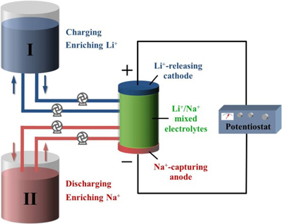 此外,該新型電池獨(dú)特的工作方式還使其具有Li+/Na+分離的功能。通過(guò)構(gòu)建如圖2所示的簡(jiǎn)單反應(yīng)體系,通過(guò)反復(fù)的充放電過(guò)程即可分別實(shí)現(xiàn)對(duì)Li+和Na+的富集,與現(xiàn)有的化學(xué)分離技術(shù)相比操作更為簡(jiǎn)便且更加綠色環(huán)保,因此該技術(shù)在海(或鹵)水中Li+和Na+的大規(guī)模分離方面具有重要的應(yīng)用前景。