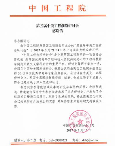 “中美工程前沿研討會(huì)”是中美兩國(guó)工程院間的一項(xiàng)重要合作機(jī)制,是兩國(guó)優(yōu)秀青年工程科技人員就共同關(guān)心的工程科技前沿問(wèn)題開(kāi)展交叉學(xué)科研討的重要平臺(tái)。自2009年起,研討會(huì)每?jī)赡昱e辦一次,分別在中國(guó)和美國(guó)輪流舉辦。每屆會(huì)議均由兩國(guó)工程院分別選出約30位本國(guó)優(yōu)秀中青年專家出席會(huì)議。本屆會(huì)議上,兩國(guó)專家圍繞儲(chǔ)能、智能交通、合成生物學(xué)和機(jī)器人等四大領(lǐng)域展開(kāi)研討交流,電工研究所陳永翀被中國(guó)工程院遴選為中方儲(chǔ)能領(lǐng)域代表出席了此次研討會(huì)。