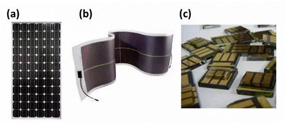 (a)單晶硅太陽(yáng)能電池;(b)薄膜太陽(yáng)能電池;(c)鈣鈦礦太陽(yáng)能電池。