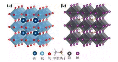 (a)鈦酸鈣(GaTiO3)晶體的原子結(jié)構(gòu);(b)鈣鈦礦太陽(yáng)能中吸光層物質(zhì)甲氨鉛碘(CH3NH3PbI3)晶體的原子結(jié)構(gòu)。