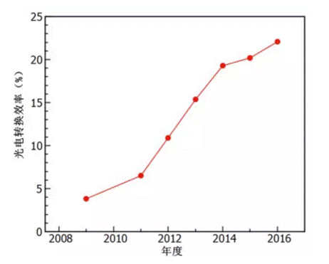鈣鈦礦結(jié)構(gòu)材料自2009年首次應(yīng)用于光伏技術(shù)以來(lái),短短六七年時(shí)間,在廣大科研人員的努力下,它的光電轉(zhuǎn)化效率就已經(jīng)從3%提高到22%。