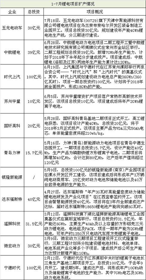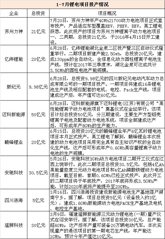 據(jù)高工鋰電不完全統(tǒng)計,1-7月動力電池投產(chǎn)金額超180億元,投產(chǎn)企業(yè)包括蘇州力神、億緯鋰能、四川新紀元、邁科新能源、贛鋒鋰業(yè)、安馳科技、四川浩海、猛獅科技等。而擴展產(chǎn)能計劃總投資超410億元,擴產(chǎn)企業(yè)包括寧德時代、微宏動力、猛獅科技、遠東福斯特、遠東福斯特、銀隆、青島力神、國軒高科、蘇州宇量、時代上汽、中航鋰電、五龍電動車等。