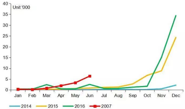 2014-2017年純電動(dòng)物流車市場(chǎng)走勢(shì)圖
