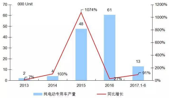 從下圖可知,以純電動(dòng)物流車為主的純電動(dòng)專用車市場(chǎng),自2013年以來(lái)一路高歌猛進(jìn),從2013年的約2000輛,發(fā)展到2015年的4.8萬(wàn)輛,2016年再度飆升至6.07萬(wàn)輛,同比增長(zhǎng)27%,相比2013年更是翻了29倍。而即使在財(cái)政補(bǔ)貼出現(xiàn)較大退坡的2017年,純電動(dòng)物流車市場(chǎng)仍然繼續(xù)快速增長(zhǎng),呈現(xiàn)出旺盛的發(fā)展勢(shì)頭。