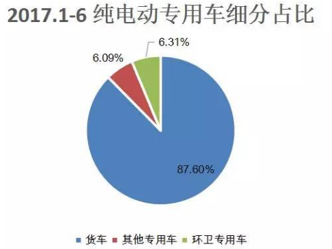 今年上半年,盡管純電動(dòng)物流車占比依然居高不下,但環(huán)衛(wèi)專用車占比開(kāi)始有所上升。從下圖可知,2017年1-6月,國(guó)內(nèi)純電動(dòng)物流車(貨車和廂式運(yùn)輸車)占比為87.6%,比2016年的93.96%有所下降,但依然是絕對(duì)主力,也是各大車企主要投入的細(xì)分市場(chǎng);環(huán)衛(wèi)專用車占比從2016年的1.8%,擴(kuò)大到2017年的6.31%。