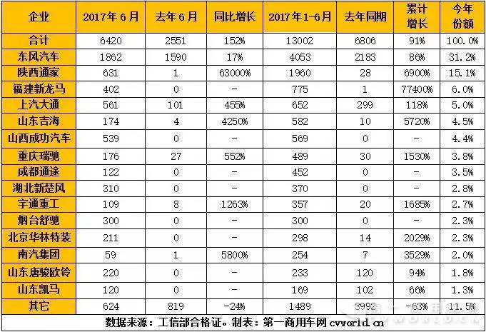 在今年純電動(dòng)專用車市場(chǎng)排名靠前的其他企業(yè),去年同期的排名基本上都目不忍睹。山東吉海新能源汽車有限公司去年上半年累計(jì)產(chǎn)量是10輛,今年已經(jīng)躍升行業(yè)第五,累計(jì)生產(chǎn)純電動(dòng)專用車582輛,同比增長(zhǎng)57倍,份額升至4.5%;山西成功汽車去年上半年產(chǎn)量為零,今年上半年躍升行業(yè)第六,累計(jì)產(chǎn)量569輛,份額上升至4.4%;成都通途交通機(jī)械實(shí)業(yè)有限公司、湖北新楚風(fēng)、煙臺(tái)舒馳去年上半年的產(chǎn)量也是0,今年1-6月都完成了逆轉(zhuǎn),實(shí)現(xiàn)了較好的市場(chǎng)業(yè)績(jī),三家企業(yè)分別排名行業(yè)第八、第九和第十一,累計(jì)生產(chǎn)純電動(dòng)專用車452輛、370輛和300輛。