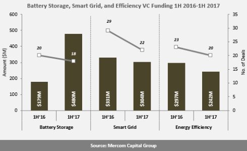 中國(guó)儲(chǔ)能網(wǎng)訊:據(jù)數(shù)據(jù)顯示,2017年上半年,全球智能電網(wǎng)、儲(chǔ)能和能效企業(yè)獲得風(fēng)投資金(包括私募股權(quán)和企業(yè)風(fēng)投)達(dá)到10.3億美元,同比增長(zhǎng)25%。