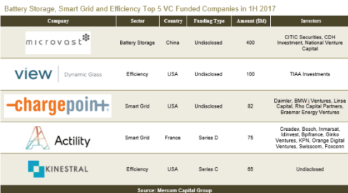 2017年上半年,智能電網(wǎng)企業(yè)獲得風(fēng)投資金3.04億美元,涉及交易22個(gè);去年同期為3.31億美元,涉及交易29個(gè)。單筆投資金額最大的是Actility獲得博世、KPN等多家公司累計(jì)7500萬(wàn)美元投資。其次是西門(mén)子對(duì)ChargePoint投資4300萬(wàn)美元。