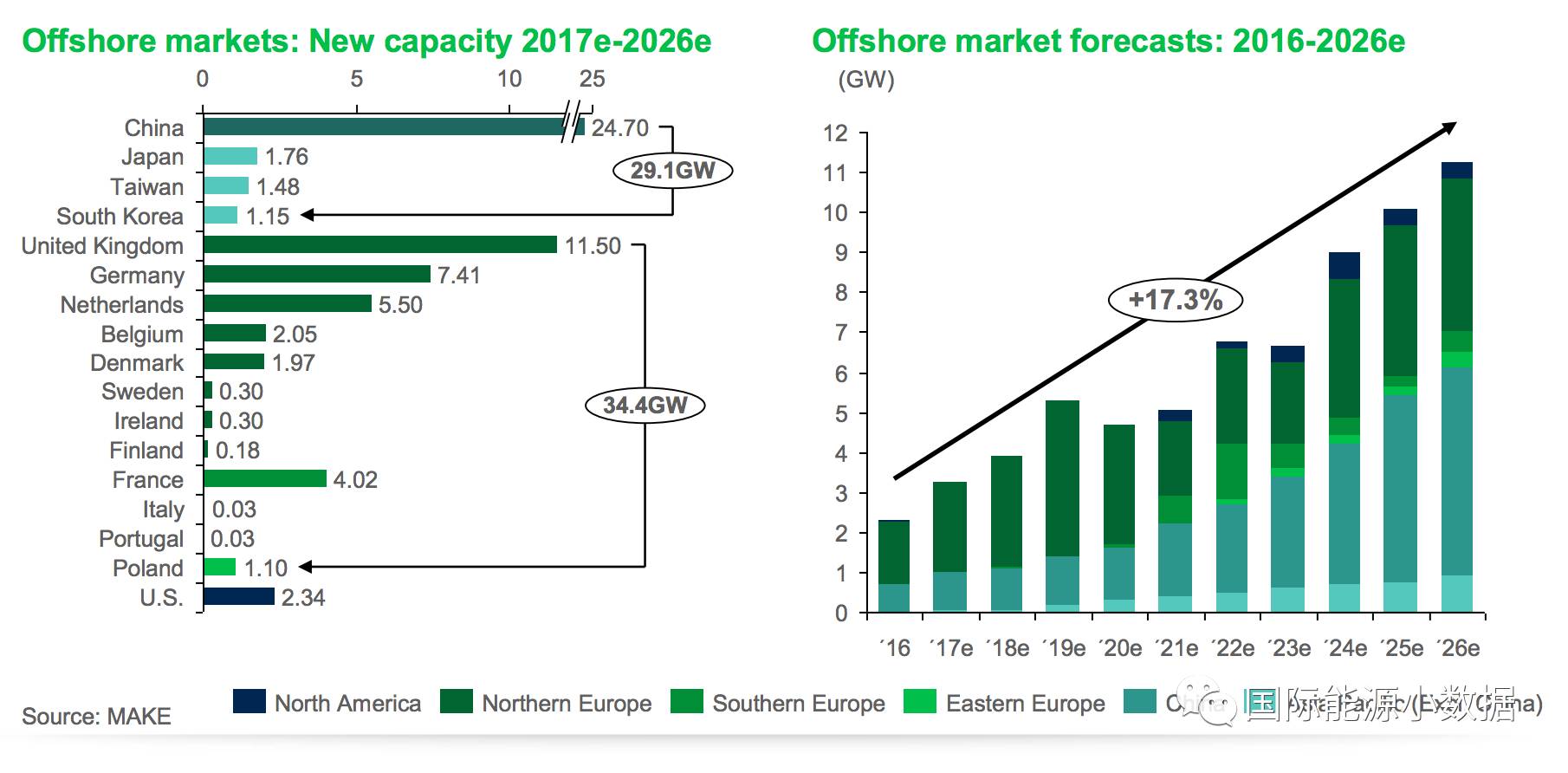中國儲能網(wǎng)訊:丹麥風(fēng)電咨詢公司MAKE預(yù)測,未來10年(2017-2026)全球海上風(fēng)電年增長率為17.3%,前5大市場分別為:中國(預(yù)計到2026年裝機24.70吉瓦)、英國(11.50吉瓦)、德國(7.41吉瓦)、荷蘭(5.50吉瓦)、美國(2.34吉瓦)。
