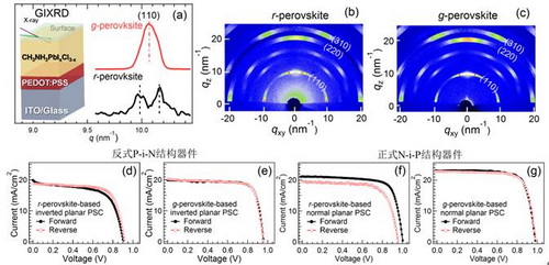 圖(a)略入射XRD測量示意圖,以及有機(jī)-無機(jī)雜化鈣鈦礦薄膜的略入射XRD譜(X光入射角度0.2度)。(b)CH3NH3PbI3-xClx薄膜二維GI-XRD譜;(c)優(yōu)化薄膜后處理?xiàng)l件后測量的二維GI-XRD譜?;?d) r-和(e) g-鈣鈦礦薄膜的反式P-i-N結(jié)構(gòu)器件J-V曲線。(f)和(g)為正式N-i-P結(jié)構(gòu)器件J-V曲線。