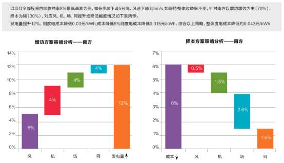 針對(duì)北方風(fēng)電場(chǎng)和南方風(fēng)電場(chǎng)的不同特點(diǎn),曹志剛給出了具體的破局路徑:北方項(xiàng)目應(yīng)以降本為主,“通過(guò)擴(kuò)大項(xiàng)目規(guī)模,共用升壓站、接入送出系統(tǒng)、場(chǎng)內(nèi)道路等來(lái)拉低項(xiàng)目初始投資?!蹦戏巾?xiàng)目應(yīng)以提高發(fā)電量為主,“在目前電價(jià)情況下,成本降低1%對(duì)IRR影響約0.25%~0.34%,發(fā)電量增加1%對(duì)IRR影響約0.58%~0.74%,成本與發(fā)電量對(duì)IRR的貢獻(xiàn)影響比約為3:7?!?