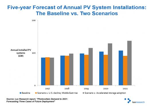 中國儲能網(wǎng)訊:美國勒克斯研究公司LuxResearch發(fā)布報告稱,2016年,全球新增太陽能光伏裝機容量達到75吉瓦,同比增長49%。預(yù)計到2021年,全球光伏裝機容量累計近800吉瓦,年復(fù)合增率約為6%。