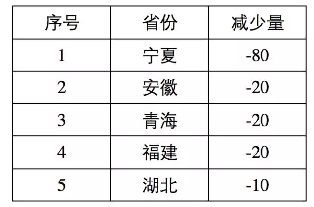 相對于2016年指標減少的省份一共有5個省,具體如下。