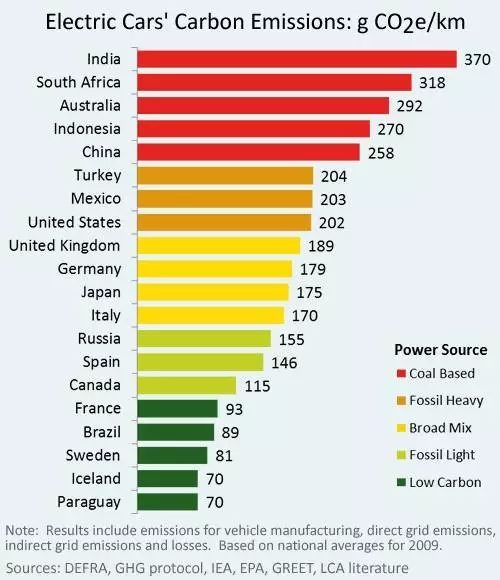 那么,電動車制造產生的碳排放占電動車生命周期內總排放多大比例呢?這個問題要看在哪個國家,因為各國發(fā)電結構(化石能源發(fā)電比例和輸變電損失)有所不同。以中國為例,電動車生命周期內單位碳排放為258克/公里,那么生產制造電動車過程碳排放占比約為27%。而在低碳電源為主的國家,比如法國,電動車生命周期內單位碳排放為93克/公里,那么電動車制造碳排放占比高達75%。