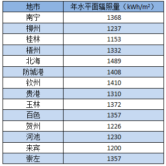 廣西總體太陽輻照資源由南到北依次遞減,最高為廣西南部北海地區(qū),最少為廣西北部山區(qū)。年太陽總輻射為3682.2-5642.8兆焦/米2,太陽能總儲量為1.03*1015兆焦。