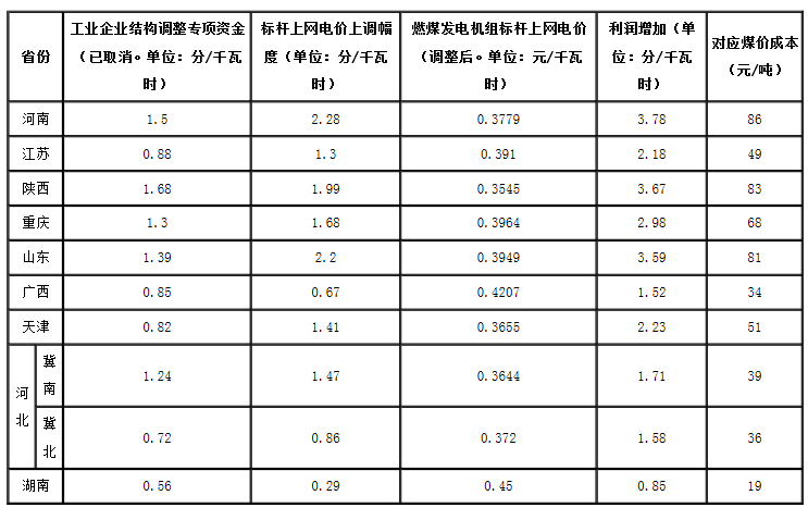 7月10日,河南省發(fā)改委率先發(fā)布電價調整政策,將上網(wǎng)電價提高0.0228元/千瓦時,上調后燃煤發(fā)電機組標桿上網(wǎng)電價(含脫硫、脫硝、除塵電價)為0.3879元/千瓦時。