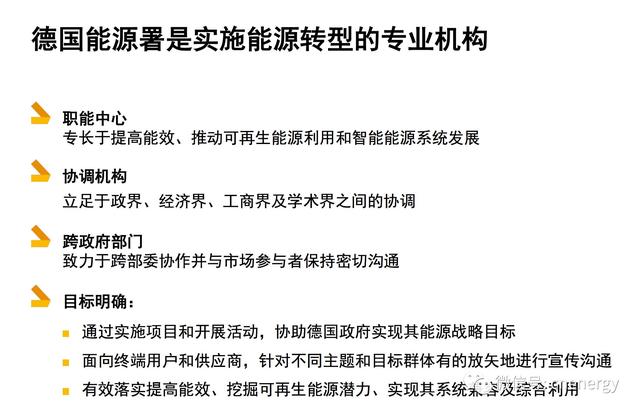 德國能源署要與各個能源轉(zhuǎn)型所涉及的領(lǐng)域,和政府來進(jìn)行合作討論,找出解決方案。特別是幫助政府修訂規(guī)則。