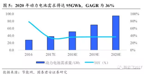 動(dòng)力領(lǐng)域需求高速增長(zhǎng),軟包滲透率加速提升。2016年軟包在動(dòng)力領(lǐng)域的滲透率較低,預(yù)計(jì)約為12%,但自從去年新能源汽車推廣政策與能量密度聯(lián)動(dòng)后,在2020年電池單體能量密度350wh/kg,系統(tǒng)能量密度260wh/kg的指引下,軟包電池作為當(dāng)前性能最高的動(dòng)力電池,卓越性能在動(dòng)力領(lǐng)域的認(rèn)可度不斷提升,我們預(yù)計(jì)至2020年軟包在動(dòng)力領(lǐng)域的滲透率將達(dá)32%左右,其中軟包電池需求量為30GWh,GAGR為75%,軟包的需求量增速將超過動(dòng)力鋰電池的增速。