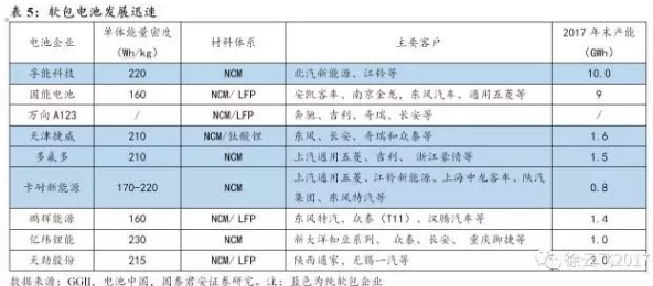 三元軟包能量密度大幅提升。高工鋰電數(shù)據(jù)顯示,截止2017年5月,軟包電池單體能量密度超過160wh/kg的企業(yè)有14家,部分廠商的軟包單體能量密度達(dá)到220wh/kg及以上,如孚能科技等,孚能科技PACK后的系統(tǒng)能量密度在140-160wh/kg,遠(yuǎn)高于補(bǔ)貼能量密度要求,預(yù)計(jì)其配套穩(wěn)定的表現(xiàn)將持續(xù)促進(jìn)其他企業(yè)在軟包動(dòng)力鋰電池方面的研發(fā)布局和生產(chǎn)競(jìng)爭(zhēng)。