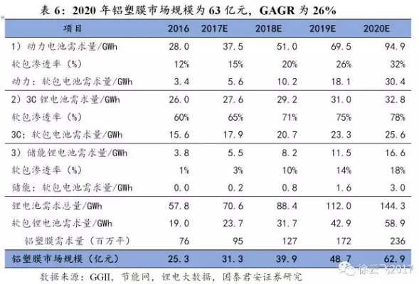 隨著軟包鋰電池需求擴(kuò)張,2020年我國(guó)鋁塑膜市場(chǎng)規(guī)模將達(dá)63億元。我們根據(jù)2017年-2020年的動(dòng)力儲(chǔ)能和3C軟包鋰電池需求,分別根據(jù)動(dòng)力儲(chǔ)能和3C不同類型的鋁塑膜價(jià)格,計(jì)算得出2017-2019 年我國(guó)鋁塑膜需求為 0.95 億平、1.27億平、1.72億平,2.36 億平,對(duì)應(yīng)市場(chǎng)空間為31億元、39億元、49億元、63億元,GAGR為26%。