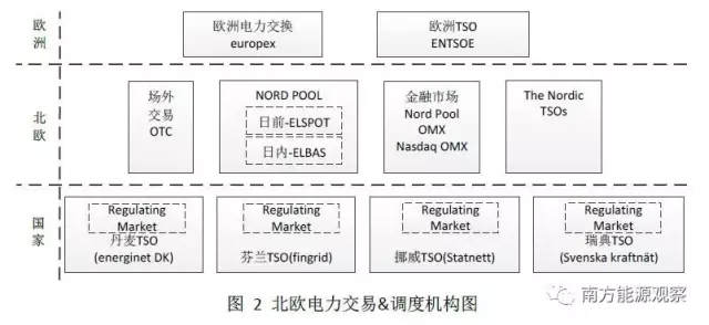北歐電力市場交易機構與調度機構分開,交易機構負責電力的物理和金融交易(歐洲電力交易,europex),調度機構(輸電系統(tǒng)運營者,TSO)運營實時平衡市場,負責電力運行安全和實時平衡。具體如下圖所示。