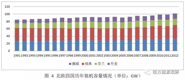 對比北歐四國1991年以來的裝機容量和電量增長情況如下圖所示。