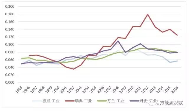 1995-2016年間,北歐四國工業(yè)電價(不含稅費)總體呈現波動上升的趨勢,但是近幾年電價有下降趨勢。對比批發(fā)市場價格,挪威、瑞典、丹麥基本與批發(fā)市場價格波動趨勢一致,芬蘭電價則相對平緩。北歐基本實現用戶側價格與批發(fā)市場價格的傳導機制。