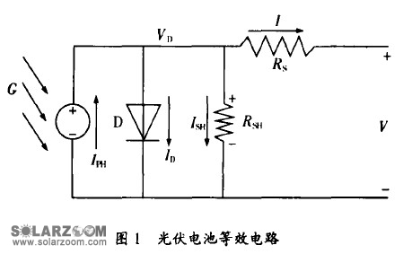 單體光伏電池片(cell)是光伏電池的最基本單元。在使用光伏電池供電時,單體電池片的容量較小,一般不能滿足負載的用電需求。因此,將幾片、幾十片或幾百片單體電池經(jīng)過串、并聯(lián)連接起來構(gòu)成組合體,形成光伏電池板。工程上應(yīng)用的光伏電池板是光伏電池使用的基本單元, 其輸出電壓一般為十幾至幾十伏左右。此外,還可以根據(jù)負載容量需求,將若干個光伏電池板經(jīng)過串、并聯(lián)組成功率較大的實際供電裝置,稱為光伏電池。圖1為較常見的一種光伏電池的等效電路。