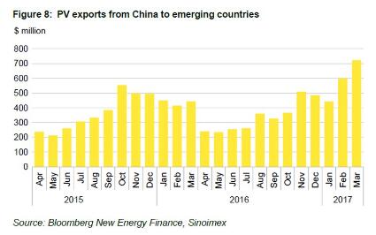 總體而言,今年一季度價值18億美元的中國太陽能光伏設備出口到發(fā)展中國家。其中,南亞占大份額,進口量從2016年一季度的7100萬美元躍增至今年一季度的2.15億美元,其次占大比例的是拉丁美洲和加勒比海地區(qū)。
