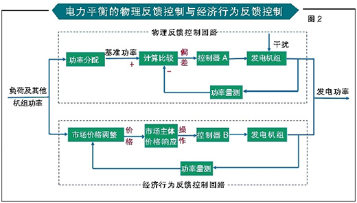 電力實(shí)時(shí)平衡屬于電力系統(tǒng)運(yùn)行的硬性物理約束,并非僅由市場(chǎng)供需平衡所決定的軟性約束,需要通過自動(dòng)控制(一、二、三次調(diào)頻控制軟硬件)裝置來實(shí)現(xiàn),難以單純通過調(diào)度員的操作來保證。在電力市場(chǎng)環(huán)境下,維持電力實(shí)時(shí)平衡的機(jī)制,既包括物理反饋控制,也包括基于市場(chǎng)價(jià)格的市場(chǎng)主體經(jīng)濟(jì)行為反饋控制,因此如圖2所示,本文基于控制理論的統(tǒng)一框架以發(fā)電機(jī)組功率調(diào)節(jié)過程為例,對(duì)兩類反饋進(jìn)行說明。