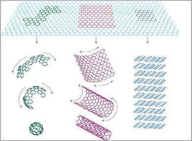 單原子層石墨烯與富勒烯、碳納米管以及石墨的結(jié)構(gòu)關(guān)系示意圖,(a)石墨烯、(b)富勒烯、(c)碳納米管、(d)石墨