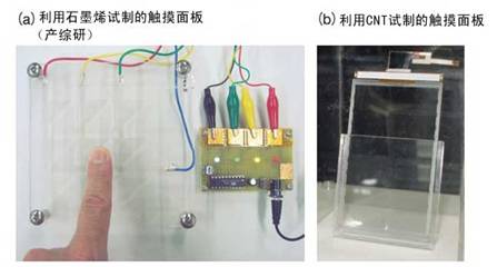 (a)為產(chǎn)綜研以石墨烯為透明導(dǎo)電膜制作的觸摸面板。(b)為使用CNT的例子