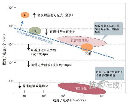 石墨烯在理論上有望避開這種此消彼長(zhǎng)的關(guān)系成為理想的透明導(dǎo)電膜。其原因是,由于載流子遷移率非常高,即使載流子密度較低,導(dǎo)電性也不容易下降。而載流子密度較低的話,會(huì)比較容易穿過更大波長(zhǎng)范圍的光。相當(dāng)于單個(gè)原子的超薄厚度同樣有助于提高透明性。