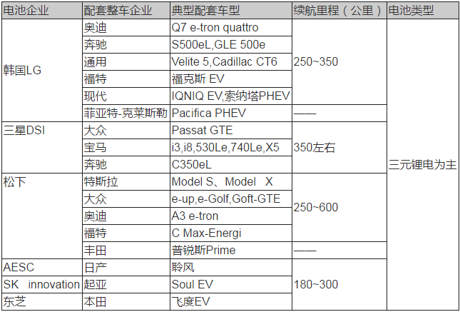 當(dāng)前,全球新能源車市場(chǎng)進(jìn)入蓬勃發(fā)展的關(guān)鍵時(shí)期,主流汽車企業(yè)紛紛布局新能源汽車,鋰電池產(chǎn)業(yè)鏈因此快速成熟將進(jìn)一步推動(dòng)新能源汽車的規(guī)模化應(yīng)用。從全球角度看,典型車企配套車型主要采用日韓動(dòng)力電池,以三元鋰為主,續(xù)航里程基本都達(dá)到或超過(guò)350公里的水平。