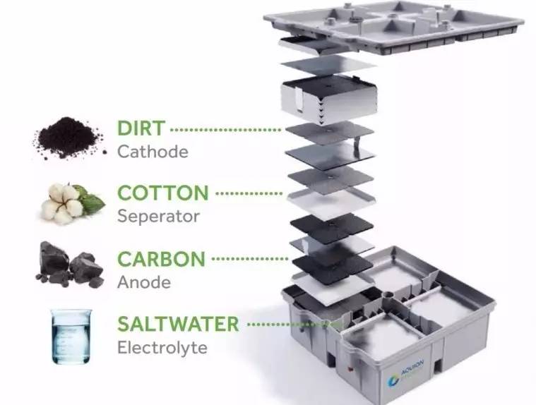 Aquion電池組件的構(gòu)成:陰極為土(含氧化錳),陽(yáng)極為碳,電解液為鹽水來(lái)源:windpowerengineering.com