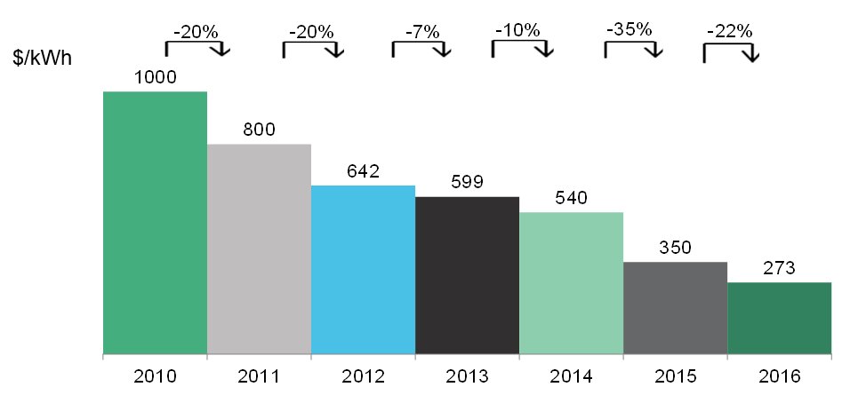 鋰電池成本從2010年以來(lái)已經(jīng)下降了72%來(lái)源:彭博新能源財(cái)經(jīng)